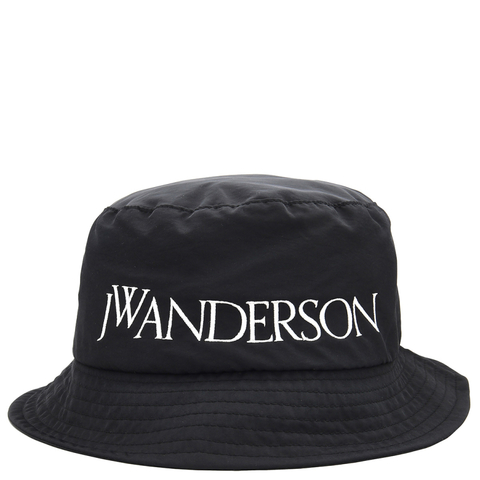 JW Anderson Mens Hats. Fashion category: Hats. SKU: AC0347-FA0214-BLACK. Color: Black. JW Anderson JWA Logo Bucket Hat. This bucket hat features a topstitched brim, a white embroidered logo, and a nylon blend lining. 65% Nylon, 35% Polyester.