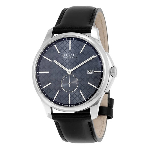 Stainless steel case with a black leather strap. Fixed stainless steel bezel. Grey (diamond pattern) dial with silver-tone hands and index hour markers. Minute markers around the outer rim. Dial Type: Analog. Date display at the 3 o'clock position. Seconds sub-dial above the 6 o'clock position. Automatic movement with a 38-hour power reserve. Scratch resistant sapphire crystal. Pull / push crown. Transparent case back. Case diameter: 40 mm. Case thickness: 9.3 mm. Round case shape. Band width: 20 mm. Band length: 8 inches. Deployment clasp. Water resistant at 50 meters / 165 feet. Functions: date, hour, minute, second. Dress watch style. Gucci G-Timeless Automatic Grey Dial Black Leather Mens Watch YA126319.