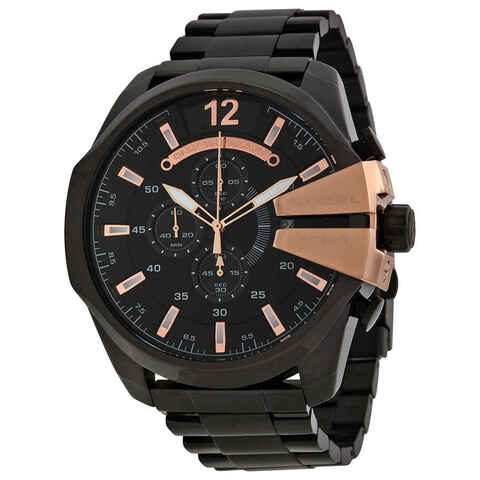 Black ion-plated stainless steel case and bracelet. Fixed black ion-plated bezel. Black dial with luminous rose gold-tone hands and index hour markers. An Arabic numeral marks the 12 o'clock position. Minute markers around the outer rim. Dial Type: Analog. Luminescent hands and markers. Date display at the 3 o'clock position. Chronograph - three sub-dials displaying: 60 second, 60 minute and 1/10th of a second. Quartz movement. Scratch resistant mineral crystal. Pull / push crown. Solid case back. Case size: 59 mm x 51 mm. Case thickness: 12 mm. Round case shape. Band width: 25 mm. Deployment clasp. Water resistant at 100 meters / 330 feet. Functions: chronograph, date, hour, minute, second. Casual watch style. Diesel Chief Chronograph Black Dial Stainless Steel Mens Watch DZ4309.
