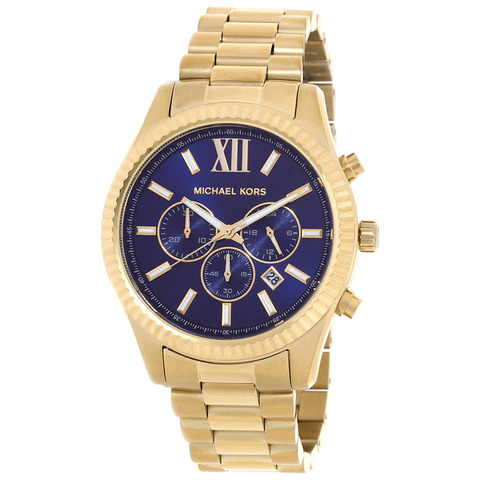 Gold-tone stainless steel case and bracelet. Fixed gold-tone stainless steel bezel. Blue dial with gold-tone hands and index-Roman numeral hour markers. Minute markers around the outer rim. Dial Type: Analog. Date display between 4 and 5 o'clock position. Chronograph - three sub-dials displaying: 60 second, 30 minute and 24 hour. Quartz movement. Scratch resistant mineral crystal. Pull / push crown. Solid case back. Round case shape, case size: 44 mm. Band width: 22 mm. Fold over clasp with a safety release. Water resistant at 100 meters / 330 feet. Functions: chronograph, date, hour, minute, second. Lexington Series. Sport watch style. Michael Kors Lexington Chronograph Quartz Blue Dial Mens Watch MK9153.