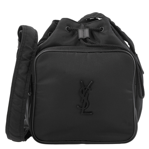Saint Laurent Mens Crossbody. SKU: 793238 FAC21 1000. Color: Black. Size: 8 W x 9 H x 5.5 D. Saint Laurent Niki Small Nylon Bucket Bag. This bucket bag in nylon offers a soft, lightweight take on the iconic silhouette. This bucket version is decorated with a tonal Cassandre for a subtle signature finish. Designed with a top pull-cord closure, it opens to one main compartment with an interior zip pocket for essentials. An exterior zipper pocket with logo hardware adds both practicality and a refined branded touch. Made in Italy.