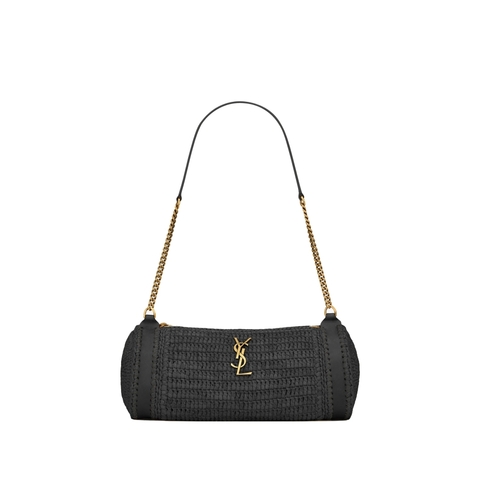 Saint Laurent Ladies Shoulder Bag. SKU: 744504 GAABN 1000. Color: Black/Black. Saint Laurent Small Cassandre Cylindric Bag. The Saint Laurent Small Cassandre Cylindric Bag offers a refined summer aesthetic with its minimalist silhouette and artisanal craftsmanship. Made from unlined raffia, this lightweight design features a top zip closure opening to a single main compartment. The front is accented with the iconic interlaced YSL hardware in a gold-tone finish. Carry: Shoulder strap with 9.5 drop. Dimensions: 9.5 4.5 2.5 (W H D). Made in Madagascar.