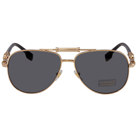 Versace Sunglasses. Color code: 100287. Shape: Pilot. Lens Width: 57 mm. Lens Bridge: 14 mm. Arm Length: 140 mm. 100% UV protection. Frame Material: Metal. Frame Color: Gold. Lenses Type: Dark Grey. Rim Style: Full-Rim. UPC/EAN code: 8056597525145. Versace Dark Grey Pilot Unisex Sunglasses VE2236 100287 59.