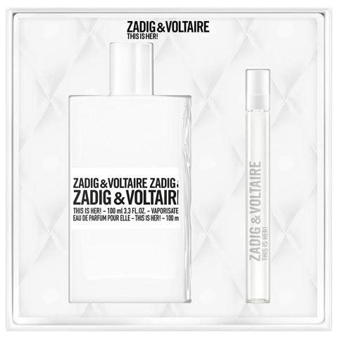 Launch year: 2016. Fragrance Family: Amber Vanilla. Top notes: Pink pepper, Silkwood blossom, Jasmine sambac. Heart notes: Whipped cream, Vanilla, Chestnut. Base notes: Sandalwood, Cashmere wood. Design house: Zadig & Voltaire. Design house category: fashion. Design house country: France. Scent name: This Is Her!. Gender: Ladies. Category: Fragrance. SubType: Gift Set. Barcode: 3423222124304. Zadig & Voltaire Ladies This Is Her! Gift Set Fragrances 3423222124304. <br/><br/> This item is only valid for shipment in the Contiguous United States & Canada.