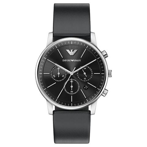 Silver-tone stainless steel case with a black leather strap. Fixed silver-tone stainless steel bezel. Black dial with silver-tone hands and index hour markers. Minute markers around the outer rim. Dial Type: Analog. Date display between 4 and 5 o'clock position. Quartz movement. Scratch resistant mineral crystal. Pull / push crown. Round case shape, case size: 42 mm. Band width: 22 mm, band length: 7.5 inches. Buckle clasp. Water resistant at 50 meters / 165 feet. Functions: chronograph, date, hour, minute, second. Minimalist Series. Fashion watch style. Emporio Armani Minimalist Black Dial Mens Watch AR11774.