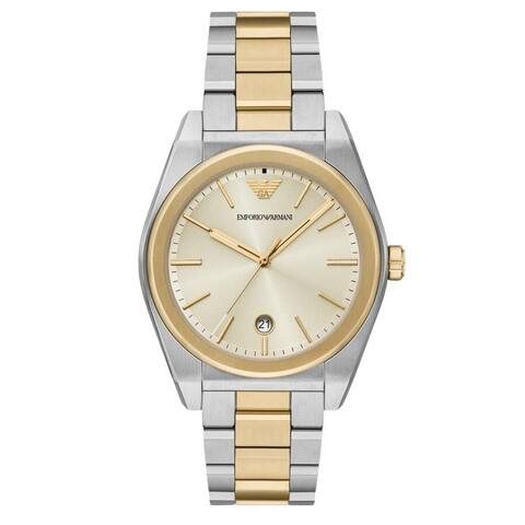 Silver-tone stainless steel case with a two-tone stainless steel bracelet. Fixed yellow gold-tone stainless steel bezel. Yellow dial with yellow gold-tone hands and index hour markers. Minute markers around the outer rim. Dial Type: Analog. Date display at the 6 o'clock position. Quartz movement. Scratch resistant mineral crystal. Pull / push crown. Round case shape, case size: 41 mm. Band width: 20 mm, band length: 7.5 inches. Fold over clasp. Water resistant at 50 meters / 165 feet. Functions: date, hour, minute, second. Federico Series. Fashion watch style. Emporio Armani Federico Yellow Dial Mens Watch AR11716.