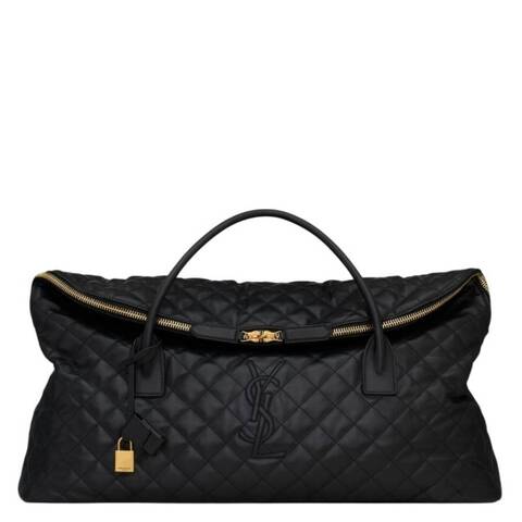 Saint Laurent Ladies Handbag. SKU: 736009AABK91000. Color: Black. Size: 22 x 19 x 7.4. Saint Laurent Quilted Leather Giant Travel Bag. This maxi supple bag is crafted from quilted calf leather and embroidered with a tone-on-tone Cassandre motif. Designed with top handles and a lock housed in a detachable leather case, it balances elegance with functionality. The bag features light bronze-toned metal hardware, a zip closure, and an interior key chain with padlock keys secured by a snap. Finished with an organic cotton lining, the interior includes a zip pocket and a flap pocket. Material: Calfskin Leather. Made in Italy.