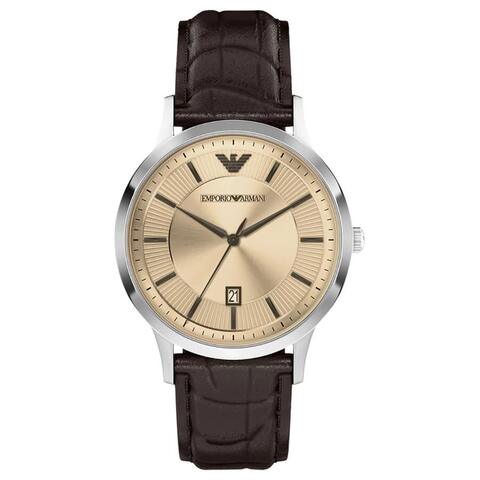 Silver-tone stainless steel case with a brown leather strap. Fixed silver-tone stainless steel bezel. Yellow dial with black hands and index hour markers. Dial Type: Analog. Date display at the 6 o'clock position. Quartz movement. Scratch resistant mineral crystal. Pull / push crown. Round case shape, case size: 43 mm. Band width: 22 mm, band length: 7.5 inches. Fold over clasp. Water resistant at 50 meters / 165 feet. Functions: date, hour, minute, second. ReNATO Series. Fashion watch style. Emporio Armani ReNATO Yellow Dial Mens Watch AR11783.