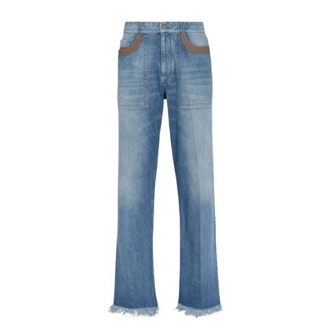 Fendi Mens Bottoms. Fashion category: Jeans & Denim. SKU: FLP317-AN4W-F0QG0. Color: Dark Blu. Fendi MensFrayed Hem Denim Jeans. These denim jeans feature front suede inserts and frayed hems, complemented by a zip-and-button closure, classic five-pocket styling, and a jacquard Fendi Roma patch at the back. 100% cotton. Made in Italy.
