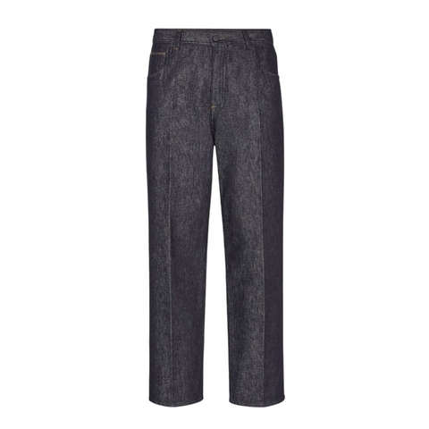 Fendi Mens Bottoms. Fashion category: Jeans & Denim. SKU: FLP285-ASD0-F0RBB. Color: Blue. Fendi Straight-Cut Selleria Jeans. Mens jeans crafted from pure cotton denim in a dark wash, featuring a straight cut and relaxed fit with pressed creases. Designed with a five-pocket layout, front belt loops, and a stamped deer leather patch at the back adorned with Selleria stitching. Finished with a branded button closure and hidden zip for a refined look. Material: 100% Cotton.