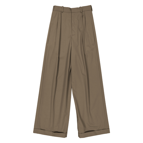 Loewe Ladies Bottoms. Fashion category: Pants & Leggings. SKU: S540Y04XIE.6975. Color: Khaki Brown. Loewe Cotton and Silk Pleated Trousers. These trousers are crafted from lightweight soft cotton-silk gabardine, featuring a relaxed fit with a mid-rise waist and long, loose legs with a low crotch. The design includes pleats at the front, pressed creases front and back, a concealed zip fastening, seam pockets, a rear jet pocket, and cuffed hems. Finished with signature Anagram embroidery at the back. 90% Cotton, 10% Silk. Made in Italy.