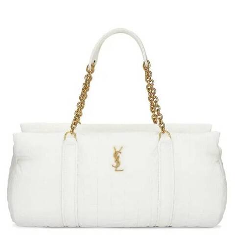 Saint Laurent Ladies Travel Bag. SKU: 757209 FAC8J 1916. Color: Milky White. Size: 18.1 x 7.1 x 7.5. Saint Laurent Milky White Gloria Travel Bag. Supple travel bag crafted in carre-quilted jacquard featuring the Cassandre motif. Designed with a concealed top zip closure and reinforced nylon-and-chain shoulder straps, it is made from virgin wool, polyamide, silk, and brass. The bag is lined with canvas, finished with bronze-toned hardware, includes one flat pocket, and has a handle drop of 23 cm (9.1 inches). Material: Virgin wool, Polyamide, Silk, Brass. Made in Italy.