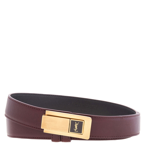 Saint Laurent Ladies Belts. Fashion category: Belts. SKU: 806631 AAD6F 6725. Color: Hot Wine. Saint Laurent Charniere Buckle Belt In Smooth Leather. Belt featuring the Cassandre motif, crafted with bronze-toned hardware. Measures 2.5 cm (1) in width and is fully adjustable for a customized fit. Material: Calf Leather. Made in Italy.