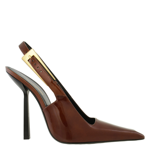 Saint Laurent Ladies Heels. SKU: 763417 AAAPQ 2531. Color: Fluffy Chataigne. Saint Laurent Patent Leather Lee Slingback Pumps. Slingback pumps designed with a square pointed toe and a covered asymmetric stiletto heel. The silhouette is defined by a square-cut vamp and an adjustable buckle slingback strap, finished with a leather sole and a total heel height of 11.5 cm (4.5 inches). Material: Leather. Made in Italy. <br/><br/><b>Please visit the brand website for sizing information.</b>