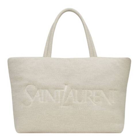 Saint Laurent Mens Tote. SKU: 756269 FADNJ 9052. Color: Chalk Beige/Chal Bei. Size: 16.119.7 x 16.9 x 6.7. Saint Laurent Padded Jersey Tote Bag. This spacious tote bag is crafted from padded jersey and fully lined in matching tonal jersey. Decorated with the Saint Laurent signature, it features a clean, minimalist design with a practical interior zip pocket for everyday essentials. Material: Cotton. Made in Italy.