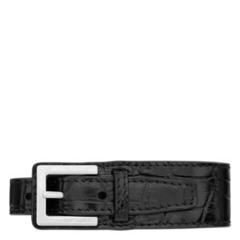 Saint Laurent Mens Bracelets. SKU: 801790 AADVV 1000. Color: Bkack. Saint Laurent Leather Belt Bracelet. Asymmetrical belt-style bracelet crafted from crocodile-embossed leather, detailed with a square pin buckle and matching leather loop. It features a silver-toned hardware, and is finished with a Saint Laurent Paris engraving for a distinctive signature accent. Material: Leather. Made in Italy.