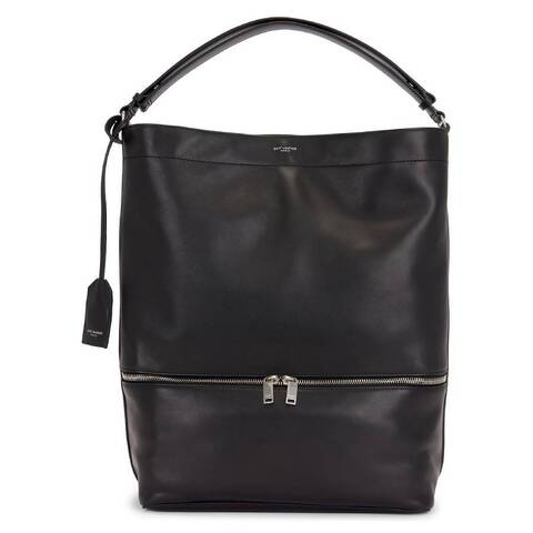 Saint Laurent Mens Tote. SKU: 797748 AAD45 1000. Color: Black. Size: 11.8 x 15.7 x 6.3. Saint Laurent Paris Long Hobo In Black. Large leather hobo bag lined in tonal suede, featuring the Saint Laurent Paris signature. This supple, elegant bag comes with an adjustable strap for shoulder or crossbody wear and is detailed with a magnetic closure, one internal zip pocket, one front zip pocket, and a removable tag. Material: Calfskin. Made in Italy.