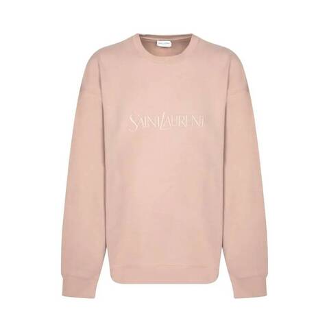 Saint Laurent Ladies Tops. Fashion category: Cardigans & Sweaters. SKU: 802001 Y36SW 9950. Color: Rose. Saint Laurent Womens Crewneck Logo Embroidered Sweatshirt. This sweatshirt features pull-on styling with a round neckline and tonal logo embroidery at the front. Crafted from jersey fabric with a fleece lining, it includes dropped shoulders, long sleeves, ribbed cuffs and hem, and a straight hemline. 100% cotton. Made in France.