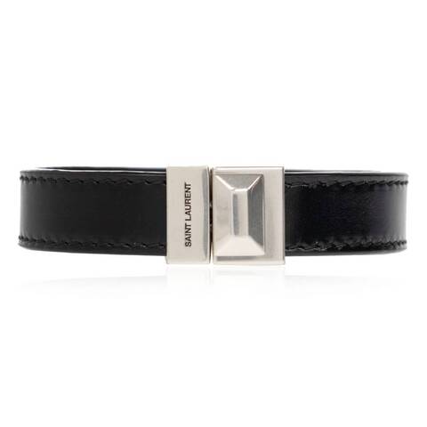Yves Saint Laurent Mens Bracelets. SKU: 756749AACJA1000. Color: Black. Saint Laurent Leather Bracelet. Sleek and modern, this Saint Laurent leather bracelet is crafted from smooth black calf leather and finished with a magnetic silver-tone clasp engraved with the iconic logo. A minimalist yet stylish accessory, its perfect for layering or wearing alone for a subtle statement. Details: Material: Calf leather, brass Clasp: Magnetic silver-tone with engraved logo. Sizes & Measurements: S: Length 16 cm Width 1.3 cm. M: Length 18 cm Width 1.3 cm. L: Length 20 cm Width 1.3 cm.