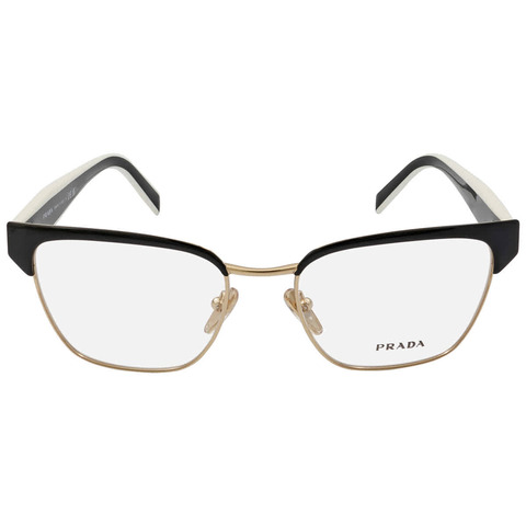 Prada Eyeglasses. Series number: PR 65YV. Color code: 18A1O1. Shape: Irregular. Lens Width: 53 mm. Lens Bridge: 18 mm. Arm Length: 140 mm. Frame Material: Metal. Frame Color: Black/Pale Gold. Lenses Type: Demo. Rim Style: Full-Rim. UPC/EAN code: 8056597626774. Prada Demo Irregular Ladies Eyeglasses PR 65YV 18A1O1 53.<br/><br/>Manufacturer's Packaging Included. Packaging Size And Color May Vary.
