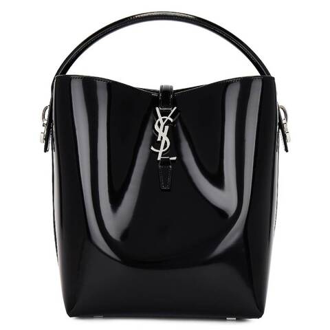 Saint Laurent Ladies Bucket Bag. SKU: 742828 AAB9H 1000. Color: Black. Size: 9 W x 9.5 H x 6.5 D. Saint Laurent Shiny Leather Le 37 Bucket Bag. This bucket bag features a signature Cassandre hook closure, a top handle, and an adjustable, detachable shoulder strap for versatile carrying options. Finished with silver-tone metal hardware, it includes one interior zippered pouch and four protective metal feet, combining elegance with practical functionality. Material: Calfskin Leather. Made in Italy.