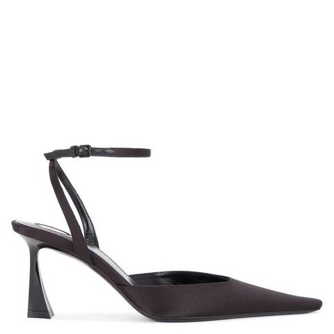 Saint Laurent Ladies Heels. SKU: 810121 9QNAO 1000. Color: Black. Saint Laurent Aimee Satin Slingback Pumps. Pumps featuring an elongated pointed toe, low-cut vamp, and an L-shaped heel, finished with an adjustable ankle strap. Crafted from certified viscose and certified silk, with a leather sole and a round Saint Laurentengraved metal plaque on the insole. Made in Italy. <br/><br/><b>Please visit the brand website for sizing information.</b>