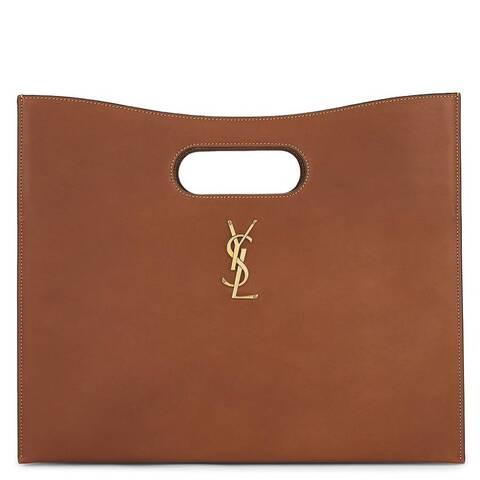 Saint Laurent Ladies Tote. SKU: 787669 AACQ3 6362. Color: Brick/Ebony Dk. Size: 13.6 x 11.2 x 3.3. Saint Laurent Junon Leather Tote Bag. This structured tote is crafted from vegetable-tanned calfskin leather and fully lined in tonal suede. Accented with the iconic Cassandre and refined contrasting trim, the design is distinguished by its accordion sides and sleek cut-out handles. Finished with bronze-toned brass hardware, the bag offers both style and function, featuring a secure interior zip pocket for everyday essentials. Handle drop: 1.5. Material: Calfskin, Made in Italy.