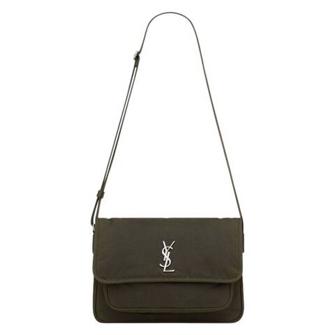 Saint Laurent Mens Messenger. SKU: 757146 FADT1 3976. Color: Dill Spice/Dill Spi/. Size: 12.8 x 9.1 x 3.9. Saint Laurent Niki Canvas Messenger Bag. The iconic Niki bag is reimagined in vintage waxed canvas, showcasing the signature Cassandre motif and an adjustable strap for versatile wear. Lightweight yet practical, the design features two main compartments and a flat pocket at the back, complemented by a canvas-lined interior, silver-toned hardware, and a secure zip pocket for essentials. Material: Cotton. Made in Italy.