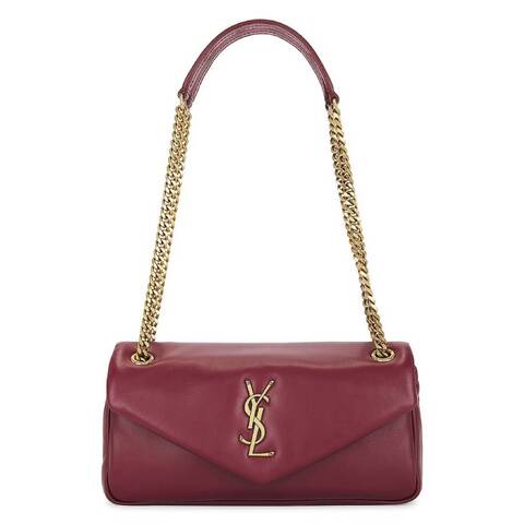 Saint Laurent Ladies Shoulder Bag. SKU: 734153 AACQO 6268. Color: Dark Bordeaux. Size: 10.2 x 5.5 x 2.7. Saint Laurent Plunged Lambskin Small Calypso Bag. This bag is decorated with the signature Cassandre and features a leather and chain crossbody strap that can be worn doubled for shoulder carry. Designed with a cotton lining and light bronze-toned metal hardware, it is finished with a snap-button closure and an interior zip pocket. The adjustable strap offers a drop of 2751 cm (10.620.1 inches) for versatile styling. Material: Lambskin. Made in Italy.