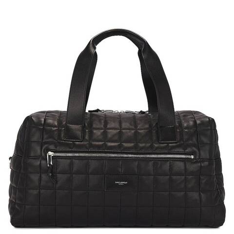 Saint Laurent Mens Duffle Bag. SKU: 594400 AAB8V 1000. Color: Black. Size: 19.6 x 9.4 x 9.8. Saint Laurent Nuxx L Padded Leather Duffle Bag. This duffle bag is crafted in Italy from padded leather with a twill lining and silver-tone hardware. It features a two-way zipper, a spacious main compartment with an internal zippered pocket, and an exterior zip pocket for additional storage and organization. Material: Leather. Made in Italy.