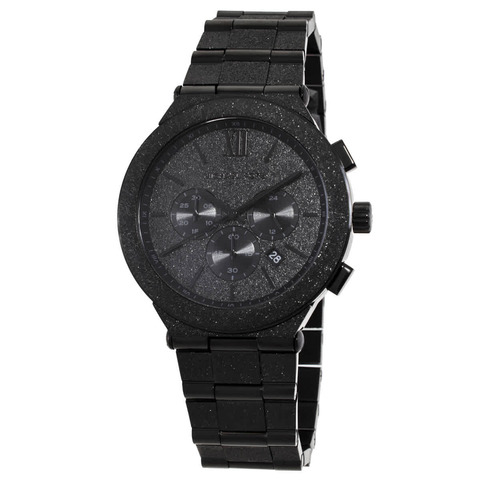 Black stainless steel case and bracelet. Fixed black stainless steel bezel. Black dial with index-Roman numeral hour markers. Minute markers around the outer rim. Dial Type: Analog. Date display between 4 and 5 o'clock position. Chronograph - three sub-dials displaying: 60 second, 30 minute and 24 hour. Quartz movement. Scratch resistant mineral crystal. Pull / push crown. Solid case back. Round case shape, case size: 44 mm. Fold over clasp with a safety release. Water resistant at 50 meters / 165 feet. Functions: chronograph, date, hour, minute, second. Billie Series. Casual watch style. Michael Kors Oversized Billie Frosted Chronograph Quartz Mens Watch MK9223.