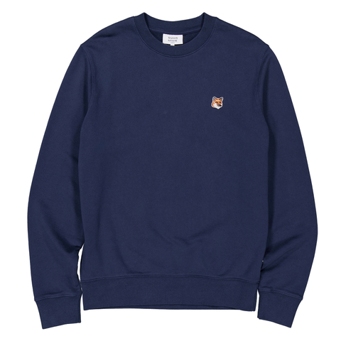 Maison Kitsune Mens Tops. Fashion category: Hoodies & Sweatshirts. SKU: LM00301KM0001. Color: Ink Blue. Maison Kitsune Fox Head Patch Sweatshirt. This cotton sweatshirt features a classic cut with long sleeves, ribbed cuffs, neckline, and waist, and is adorned with an embroidered Fox Head patch at the breast. 100% Cotton.
