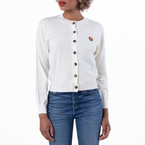 Kenzo Ladies Tops. Fashion category: Cardigans & Sweaters. SKU: FF52CA4823LB-2. Color: Off White. Kenzo Embroidered Crewneck Wool Cardigan. Crafted from soft Merino wool, this cardigan features a classic crewneck design with tone-on-tone branded buttons. The KENZO Pop crest is embroidered on the chest, while KENZO Paris is stitched at the center back. Designed for a classic fit, this piece combines comfort with signature style. Material: 100% Wool. Made in Turkey.