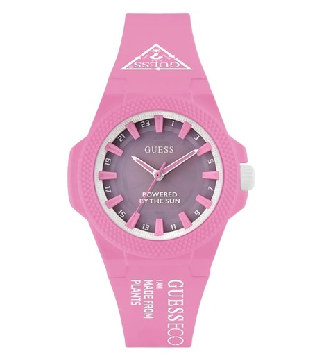 Pink stainless steel case with a pink rubber strap. Fixed pink stainless steel bezel. Pink dial with silver-tone hands and index hour markers. Dial Type: Analog. Luminescent hands. Quartz movement. Scratch resistant mineral crystal. Round case shape, case size: 40 mm, case thickness: 11 mm. Band width: 25 mm. Water resistant at 30 meters / 100 feet. Functions: hour, minute, second. Outspoken Series. Fashion watch style. Guess Outspoken Quartz Pink Dial Ladies Watch GW0587L3.