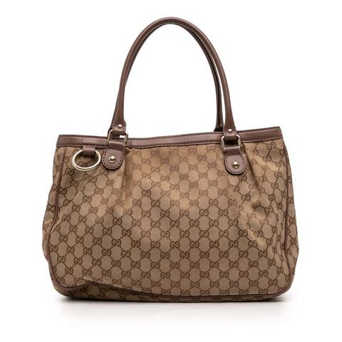 The pre-owned Gucci GG Canvas Sukey Tote is a stylish and practical designer handbag that blends iconic appeal with everyday versatility. Crafted with Guccis signature GG canvas and finished with leather trim, this tote features rolled leather handles, an open top with a magnetic snap button closure, an interior zip compartment, and interior zip and slip pockets for easy organization. Its spacious silhouette and timeless design make it an elegant choice for anyone who appreciates luxury and contemporary style.<br /><br /> Designed for both fashion and functionality, this Gucci Sukey tote offers ample room for your daily essentials while maintaining a polished and sophisticated look. The classic canvas body paired with refined leather details makes it a standout accessory for work, shopping, or casual outings. With dimensions of 11.02 x 14.96 x 4.92 inches, this designer tote is the ideal size for carrying everything you need, making it perfect for everyday use.<br /><br /> This authentic pre-owned Gucci handbag is a smart choice for buyers seeking a luxury tote at a better value. Exterior corner has been repainted. Comments: Exterior Back Stained With Others, Creased, Scratched. Exterior Bottom Stained With Others. Exterior Corners Repainted. Exterior Front Scratched, Worn, Stained With Others. Exterior Handle/Strap Worn, Cracked, Scratched, Stained With Others. Exterior Side Worn, Scratched. Exterior Top Worn. Hardware Closure Scratched. Hardware Embellishment Scratched. Hardware Practical Attachment Scratched. Zipper Scratched. Interior Lining Scratched, Stained With Others. Interior Pocket Stained With Others. Rating: Condition Rating: B+. Inclusions: None. Model: GG Canvas Sukey Tote. Item# J172VQJV9YSKZTGS. Pre-owned Gucci GG Canvas Sukey Tote Ladies 296835 520981. This is a great opportunity to own an authentic handbag at a more accessible price.
