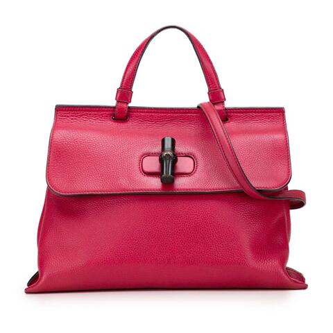 The Gucci Medium Leather Bamboo Daily Satchel is a sophisticated designer handbag crafted from premium leather, featuring a structured silhouette, a flat top handle, and a detachable flat leather strap for versatile wear. The front flap is secured with the houses signature bamboo bullet twist-lock closure, while the interior offers both zip and slip pockets to keep essentials organized. Measuring 8.66 x 12.80 x 4.72 inches, this elegant satchel is a timeless choice for anyone seeking luxury and contemporary style.<br /><br /> Designed for both fashion and functionality, this pre-owned Gucci Medium Leather Bamboo Daily Satchel blends iconic craftsmanship with practical design. Its spacious interior, refined leather construction, and detachable shoulder strap make it easy to carry from day to evening, while the distinctive bamboo accent adds unmistakable designer appeal. Whether you're shopping for a classic Gucci handbag, a versatile leather satchel, or a stylish everyday designer purse, this piece is perfect for everyday use.<br /><br /> This authentic pre-owned Gucci handbag includes the shoulder strap and is identified as Model: Medium Leather Bamboo Daily Satchel, Item# OIT3Q53Z9WQGYVLQ, Style No. 392013 204990. Condition Rating: B+. Comments: Exterior Back Creased, Discolored. Exterior Bottom Worn, Stained With Others. Exterior Corners Worn. Exterior Front Worn, Creased. Exterior Handle/Strap Creased, Cracked, Worn. Exterior Side Out of Shape, Cracked. Exterior Top Worn, Cracked. Hardware Closure Scratched. Hardware Practical Attachment Rusty/Tarnished, Scratched. Zipper Scratched. Interior Lining Stained With Others. Interior Pocket Stained With Others. This is a great opportunity to own an authentic handbag at a more accessible price.