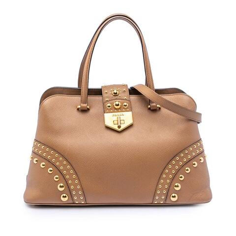 The Prada Studded Saffiano Cuir Promenade Satchel is a sophisticated designer handbag crafted from durable saffiano leather, combining timeless appeal with a modern edge. Featuring elegant flat handles, a detachable flat leather strap, and a secure top strap with twist lock closure, this satchel offers both versatility and refined structure. The thoughtfully designed interior includes a zip compartment, along with zip and slip pockets for organized storage, making it an excellent choice for carrying daily essentials in luxury and contemporary style.<br /><br /> Designed for both fashion and functionality, this pre-owned Prada satchel delivers the iconic craftsmanship and elevated design the brand is known for. Its spacious dimensions of 9.84 x 14.96 x 6.50 inches provide ample room for your essentials, while the included shoulder strap adds convenient styling options for wear by hand or over the shoulder. Whether paired with workwear or weekend looks, this authentic Prada handbag is a chic and practical investment that is perfect for everyday use.<br /><br /> This pre-owned Prada Studded Saffiano Cuir Promenade Satchel, model Studded Saffiano Cuir Promenade Satchel, Item# 7G9H94K93RYXUMVG, is a stylish opportunity for luxury lovers seeking authentic designer fashion. Inclusions: Shoulder Strap. Condition Rating: B+. Comments: Exterior Back Creased. Exterior Corners Worn. Exterior Front Scratched. Exterior Handle/Strap Worn, Stained With Others. Exterior Top Creased. Hardware Practical Attachment Scratched. Zipper Scratched. Interior Lining Stained With Others, Scratched, Creased. Interior Pocket Scratched. This is a great opportunity to own an authentic handbag at a more accessible price.