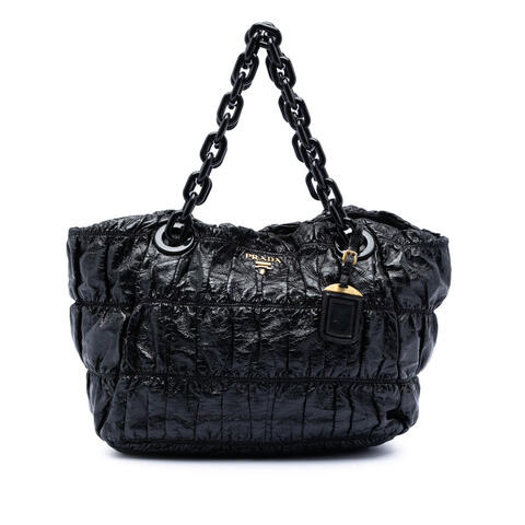Pre-owned Prada Vernice Gaufre Resin Chain Shopping Tote crafted in glossy patent leather with elegant gathered detailing and striking resin chain handles. This designer tote offers a spacious silhouette, an open top with a magnetic snap button closure, and interior zip pockets to help keep essentials organized. A sophisticated choice for day-to-night wear, it blends iconic Prada appeal with luxury and contemporary style.<br /><br /> Designed for both fashion and functionality, this Prada shopping tote is ideal for carrying your daily essentials while elevating any outfit with its polished finish and statement design. The roomy interior and practical pocket layout make it a stylish companion for work, shopping, or casual outings, making it perfect for everyday use.<br /><br /> Model: Vernice Gaufre Resin Chain Shopping Tote. Dimensions (in): 12.60 x 13.39 x 6.30. Inclusions: Name tag. Item# T32IA32ZN9HSVCH9. Condition Rating: B+. Conditions for preown: Exterior Back Stained With Others. Exterior Bottom Stained With Others. Exterior Corners Worn. Exterior Front Stained With Others. Exterior Handle/Strap Stained With Others, Scratched. Exterior Side Stained With Others. Exterior Top Cracked. Hardware Closure Scratched. Hardware Embellishment Scratched. Hardware Practical Attachment Scratched. Zipper Scratched. Interior Lining Worn, Stained With Others, Scratched. Interior Pocket Stained With Others. This is a great opportunity to own an authentic handbag at a more accessible price.