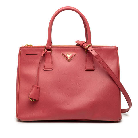 The Prada Medium Saffiano Lux Galleria Double Zip Satchel is a timeless designer handbag crafted from durable saffiano leather, featuring rolled leather handles, a detachable flat leather strap, an open top, dual zip compartments, and interior zip and slip pockets for elegant organization. With dimensions of 9.06 x 12.99 x 5.91 inches, this sophisticated satchel offers a structured silhouette that effortlessly elevates any wardrobe with luxury and contemporary style.<br /><br /> Designed for both fashion and functionality, this pre-owned Prada Galleria satchel is an ideal choice for carrying your daily essentials while maintaining a polished, refined look. The versatile design, spacious interior, and signature Prada craftsmanship make it a smart addition to any luxury handbag collection, perfect for everyday use.<br /><br /> This authentic pre-owned Prada Medium Saffiano Lux Galleria Double Zip Satchel includes a charm and shoulder strap, making it a stylish and practical investment for any fashion lover. Condition Rating: B+. Comments: Exterior Back Worn. Exterior Corners Worn. Exterior Front Worn. Exterior Handle/Strap Worn, Stained With Others. Exterior Top Cut Stitching, Cracked, Worn. Hardware Closure Scratched. Hardware Embellishment Scratched. Hardware Practical Attachment Scratched. Zipper Rusty/Tarnished, Scratched. Interior Lining Stained With Others. This is a great opportunity to own an authentic handbag at a more accessible price.