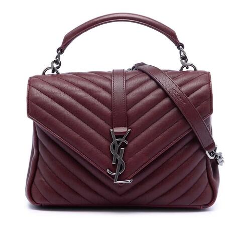 The Saint Laurent Medium Chevron Sheepskin Monogram College Satchel is a timeless designer handbag that combines iconic elegance with practical appeal. Crafted from soft chevron quilted sheepskin leather, this luxury satchel features a structured silhouette, a rolled leather top handle, a detachable curb chain shoulder strap with leather guard, a front flap with magnetic snap closure, an exterior back slip pocket, and an interior zip pocket. With dimensions of 6.69 x 9.45 x 2.36 inches, this compact yet stylish bag is ideal for carrying your essentials with luxury and contemporary style. <br /><br /> Designed for both fashion and functionality, this pre-owned Saint Laurent handbag is a versatile accessory that transitions effortlessly from day to evening. The elegant monogram detailing and classic satchel design make it a standout choice for anyone seeking an authentic Saint Laurent bag with lasting style. It also includes the shoulder strap for added carrying convenience, making it perfect for everyday use. <br /><br /> Condition Rating: B+. Comments: Exterior Back Worn. Exterior Bottom Worn. Exterior Corners Worn. Exterior Front Worn. Exterior Handle/Strap Loose Stiching, Worn. Exterior Side Worn. Exterior Top Worn. Hardware Closure Scratched. Hardware Practical Attachment Scratched. Zipper Scratched. This pre-owned Saint Laurent Medium Chevron Sheepskin Monogram College Satchel, Item# UU6UC4HKCCOFF305, model DMR428056A.1116, offers an excellent chance to own a sought-after designer handbag at a better value. Inclusions: Shoulder Strap. This is a great opportunity to own an authentic handbag at a more accessible price.