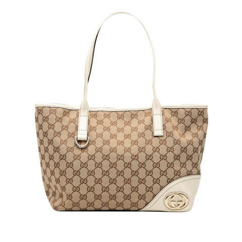 The Gucci GG Canvas New Britt Tote is a stylish and versatile designer handbag crafted with the iconic GG canvas body and complemented by flat leather straps. Featuring an open top with a magnetic closure, along with convenient interior zip and slip pockets, this tote offers both elegance and practicality for daily essentials. With dimensions of 9.06 x 10.83 x 5.31 inches, it is a chic choice for anyone seeking luxury and contemporary style.<br /><br /> Designed for both fashion and functionality, this pre-owned Gucci tote is ideal for carrying your essentials while elevating your everyday wardrobe. The classic silhouette, signature GG canvas, and thoughtfully designed interior make it a standout accessory for work, shopping, or casual outings. Its timeless appeal and practical storage options make it perfect for everyday use.<br /><br /> This authentic pre-owned Gucci GG Canvas New Britt Tote, model 169946 000926, is a wonderful choice for collectors and fashion lovers looking for designer value. Condition Rating: B+. Pre-owned condition details: Exterior bottom stained with others; exterior corners worn; exterior front stained with others; exterior handle/strap worn, cracked, and stained with others; exterior top stained with others; hardware closure scratched; hardware embellishment scratched; hardware practical attachment rusty/tarnished and scratched; zipper scratched; interior pocket stained with others. Inclusions: None. Item# ZBSH8LX9NL3P3PFE. This is a great opportunity to own an authentic handbag at a more accessible price.