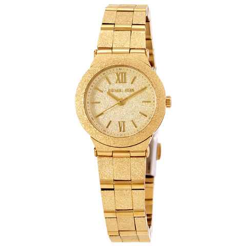 Gold-tone stainless steel case and bracelet. Fixed gold-tone stainless steel bezel. Sparkling gold-tone dial with gold-tone hands and index-Roman numeral hour markers. Minute markers around the outer rim. Dial Type: Analog. Quartz movement. Pull / push crown. Solid case back. Round case shape, case size: 26 mm. Fold over clasp. Water resistant at 50 meters / 165 feet. Functions: hour, minute, second. Billie Series. Dress watch style. Michael Kors Petite Billie Frosted Quartz Ladies Watch MK7554.
