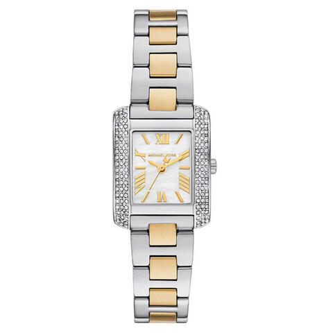 Silver-tone stainless steel case with a two-tone (silver-tone and yellow gold-tone) stainless steel bracelet. Fixed silver-tone stainless steel bezel. Mother of pearl dial with yellow gold-tone hands and Roman numeral hour markers. Dial Type: Analog. Quartz movement. Scratch resistant mineral crystal. Rectangle case shape, case size: 22 mm, case thickness: 7 mm. Band width: 14 mm, band length: 7.5 inches. Fold over clasp. Water resistant at 50 meters / 165 feet. Functions: hour, minute, second. Emery Series. Fashion watch style. Michael Kors Emery Mother of Pearl Dial Ladies Watch MK4882.