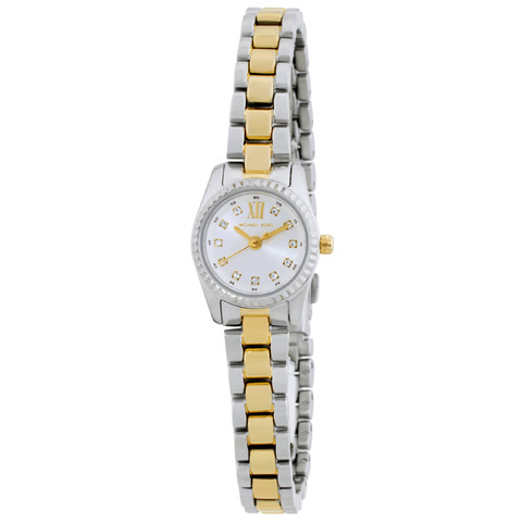 Silver-tone stainless steel case with a two-tone (silver-tone and gold-tone) stainless steel bracelet. Fixed silver-tone stainless steel bezel. White dial with gold-tone hands and crystal-Roman numeral hour markers. Dial Type: Analog. Quartz movement. Scratch resistant mineral crystal. Pull / push crown. Solid case back. Round case shape, case size: 19 mm. Deployment with push button release clasp. Water resistant at 50 meters / 165 feet. Functions: hour, minute, second. Lexington Series. Dress watch style. Michael Kors Micro Lexington Quartz Ladies Watch MK4903.