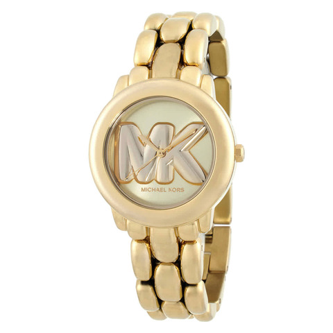 Gold-tone stainless steel case and bracelet. Fixed gold-tone stainless steel bezel. Gold-tone dial with gold-tone hands. No markers. Dial Type: Analog. Quartz movement. Scratch resistant mineral crystal. Pull / push crown. Solid case back. Round case shape, case size: 36 mm, case thickness: 10 mm. Deployment with push button release clasp. Water resistant at 50 meters / 165 feet. Functions: hour, minute, second. Phoebe Series. Casual watch style. Michael Kors Phoebe Quartz Gold Dial Ladies Watch MK4923.