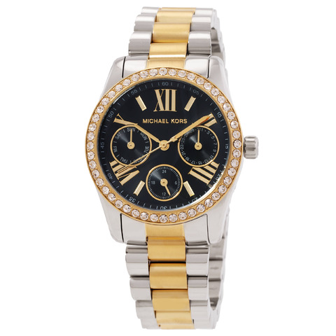 Silver-tone stainless steel case with a two-tone (silver-tone and gold-tone) stainless steel bracelet. Fixed gold-tone stainless steel crystal set bezel. Black dial with gold-tone hands and Roman numeral hour markers. Minute markers around the outer rim. Dial Type: Analog. Three sub-dials displaying: date, day and 24 hour. Quartz movement. Scratch resistant mineral crystal. Pull / push crown. Solid case back. Round case shape, case size: 33 mm, case thickness: 9 mm. Band width: 16 mm. Deployment with push button release clasp. Water resistant at 50 meters / 165 feet. Functions: date, day, hour, minute, second, 24 hour. Lexington Series. Dress watch style. Michael Kors Mini Lexington Quartz Black Dial Ladies Watch MK4925.
