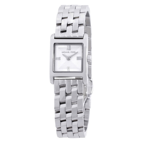 Silver-tone stainless steel case and bracelet. Fixed silver-tone stainless steel bezel. Silver-tone dial with silver-tone hands and Roman numeral hour markers. Dial Type: Analog. Quartz movement. Scratch resistant mineral crystal. Pull / push crown. Solid case back. Square case shape, case size: 19 mm, case thickness: 7 mm. Band width: 15 mm. Water resistant at 50 meters / 165 feet. Functions: hour, minute. Georgie Series. Casual watch style. Michael Kors Micro Georgie Quartz Silver Dial Ladies Watch MK4933.