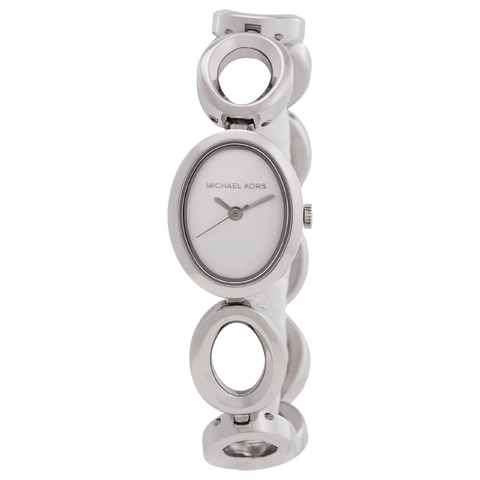 Silver-tone stainless steel case and bracelet. Fixed silver-tone stainless steel bezel. Silver-tone dial with silver-tone hands. Dial Type: Analog. Quartz movement. Pull / push crown. Solid case back. Oval case shape, case size: 20.5 x 25.5 mm. Water resistant at 30 meters / 100 feet. Functions: hour, minute, second. Maude Series. Michael Kors Maude Quartz Silver Dial Ladies Watch MK4958.