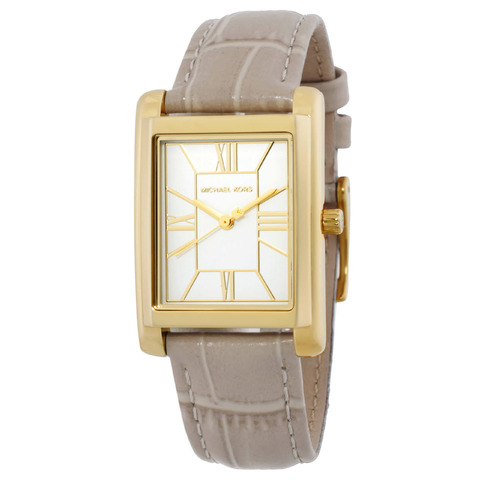 Gold-tone stainless steel case with a beige leather strap. Fixed gold-tone stainless steel bezel. White dial with gold-tone hands and index-Roman numeral hour markers. Dial Type: Analog. Quartz movement. Scratch resistant mineral crystal. Pull / push crown. Solid case back. Rectangle case shape, case size: 26 mm x 36.5 mm case, case thickness: 8 mm. Band width: 18 mm. Buckle clasp. Water resistant at 50 meters / 165 feet. Functions: hour, minute, second. Essex Series. Casual watch style. Michael Kors Essex Quartz White Dial Ladies Watch MK4964.