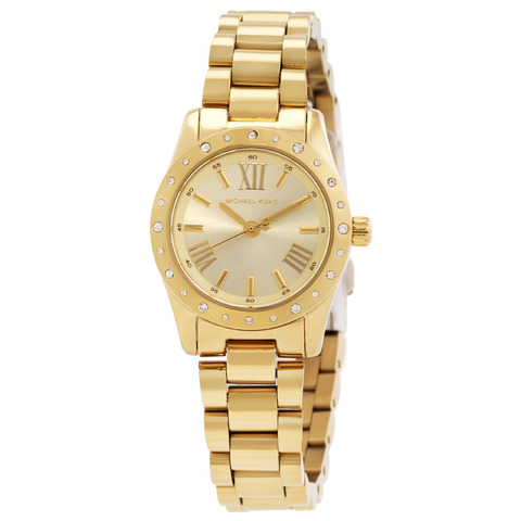 Gold-tone stainless steel case and bracelet. Fixed gold-tone stainless steel bezel. Gold-tone dial with gold-tone hands and index-Roman numeral hour markers. Dial Type: Analog. Quartz movement. Pull / push crown. Solid case back. Round case shape, case size: 26 mm. Deployment with push button release clasp. Water resistant at 50 meters / 165 feet. Functions: hour, minute, second. Additional Info: heart-shaped bracelet included. Lexington Series. Casual watch style. Michael Kors Lexington Quartz Ladies Watch and Heart Bracelet Gift Set MK4992SET.